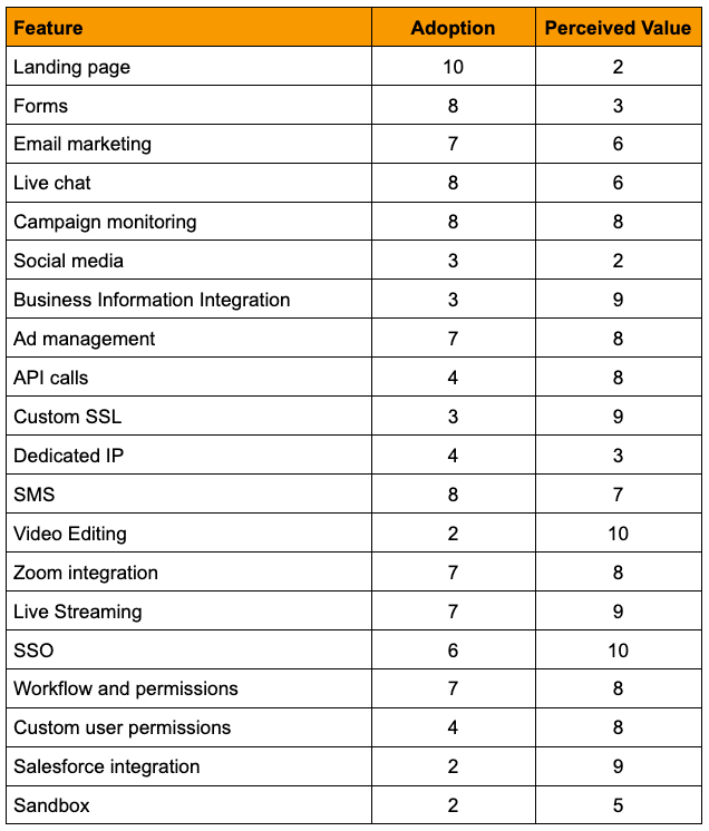 Rank them on a scale of 1-10 against adoption: how many of them are actually used, not just paid for. If you have a feature such as video editing but only 20% of your customers use it regularly, then score it 2 out of 10.