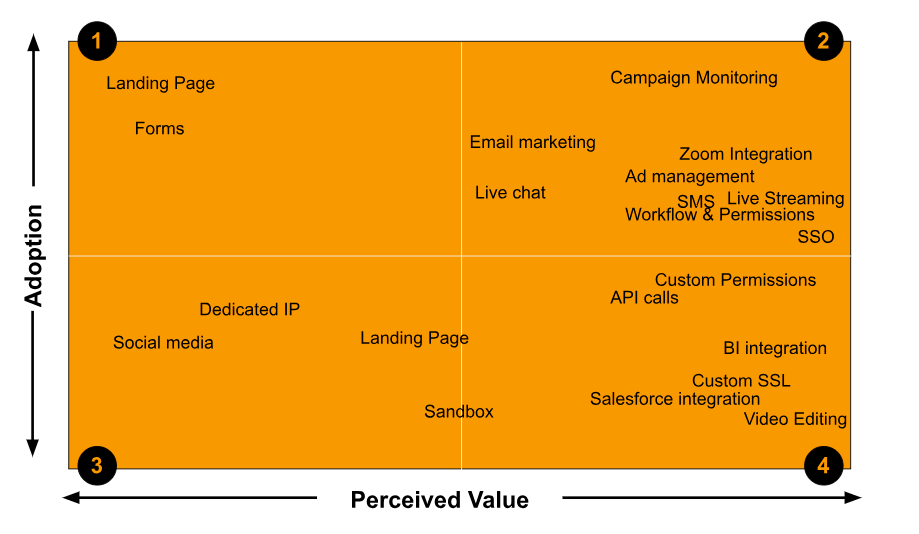 Draw a quadrant with a vertical axis that is ‘adoption’ and a horizontal axis that is ‘perceived value’ and slot the features into the four boxes based on their scores. You may end up with something like this: